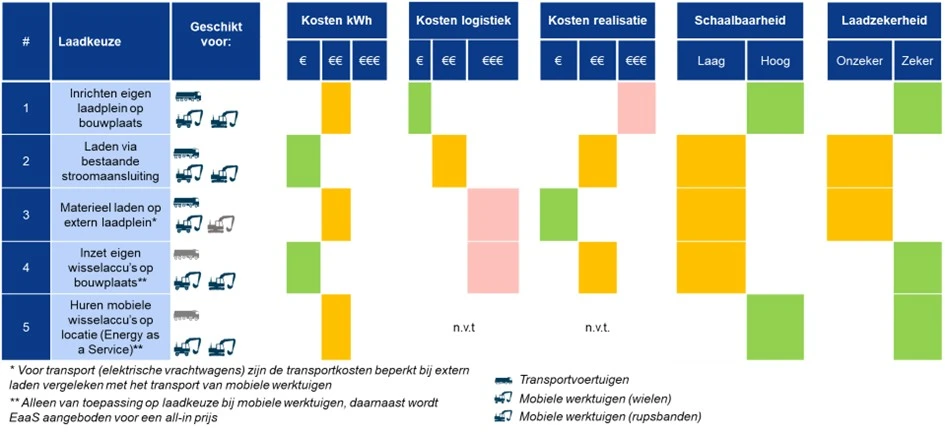 De inzichten uit de praktijk zijn gebruikt om in onderstaande tabel verschillende laadopties met elkaar te vergelijken op aspecten als kosten per kWh, kosten logistiek, kosten realisatie, schaalbaarheid en laadzekerheid. Ook is bekeken voor welk type materieel de verschillende oplossingen geschikt zijn. Een volledig kwantitatieve vergelijking van de totale laadkosten bleek echter nog niet mogelijk. Die kosten blijken sterk afhankelijk van projectspecifieke kenmerken.